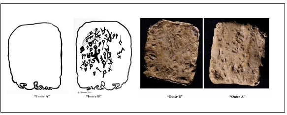 Vorder- und Rückseite (innen und außen) der auf dem Berg Ebal entdeckten „Fluch-Tafel“ (courtesy Pieter Gert van der Veen).
